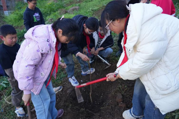 阳春三月,草长莺飞,又是一年播绿时。在第48个植树节来临之际,为深入践行“绿水青山就是金山银山”的生态理念,弘扬劳动育人精神,2026年3月10日,宜宾市一曼小学校开展了以“手植桃李,薪火相传”为主题的植树节教育活动。学校党总支书记曾向荣带领部分教师、少先队员代表一同走进“一曼桃李园”,在新老交替的劳动中体验生命成长,传承红色基因。