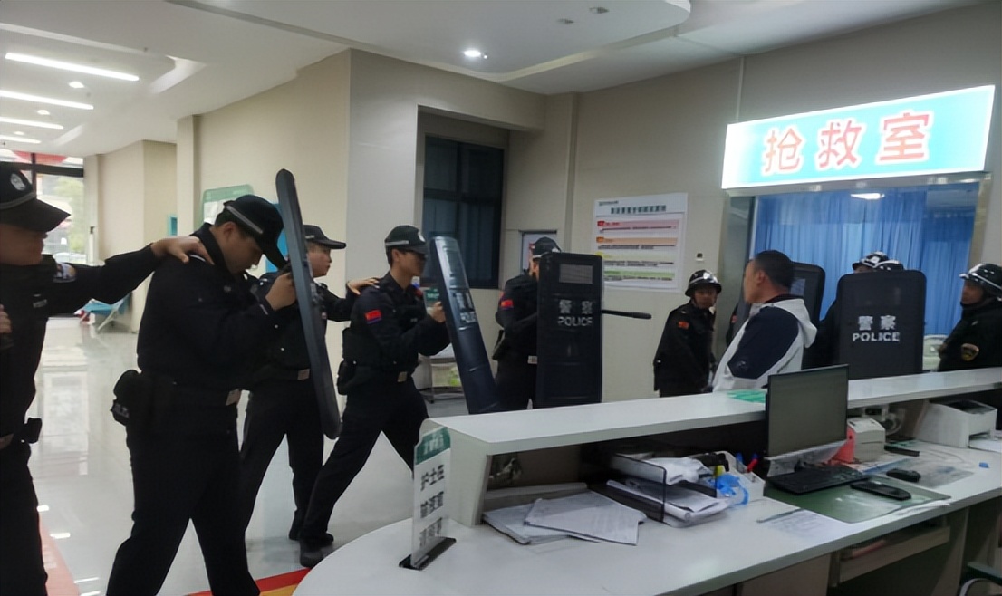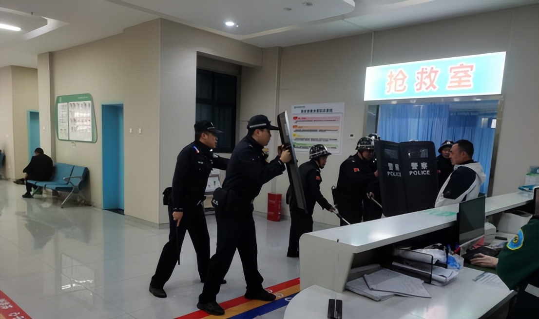 随着演练指令下达,模拟突发场景正式启动——现场瞬间进入紧张状态,医院安保人员第一时间响应,迅速携带防暴盾牌、钢叉等装备赶赴现场,进行初期管控、疏散周边群众。