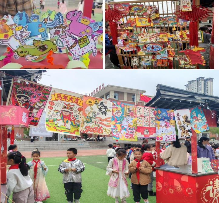 一冬巧思凝佳作,满园芳华映初心。本次春集特设寒假实践优秀作品展,高县第二实验小学校各年级佳作依次陈列,笔墨与手工相映成趣,传统与创意交织生辉,成为浸润传统文化的动人风景。妙手剪纸勾勒龙马气象,多彩画笔晕染春日烂漫。从吉祥小马绘画到立体手工,从古道文化探寻报告到马灯书签,件件作品饱含童真与匠心,承载着孩子们假期里的观察、思考与创造。