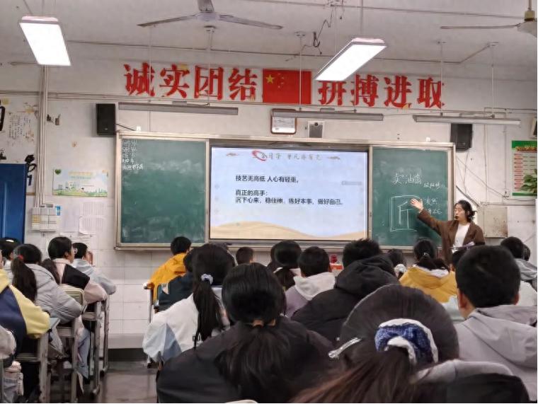 课堂上,周清文老师以“匠”为切入点,引导学生从技艺精进的角度解读文本,围绕“熟能生巧”这一核心展开讨论,带领学生品读人物对话与动作描写,体会卖油翁酌油技艺背后的专注与沉淀。