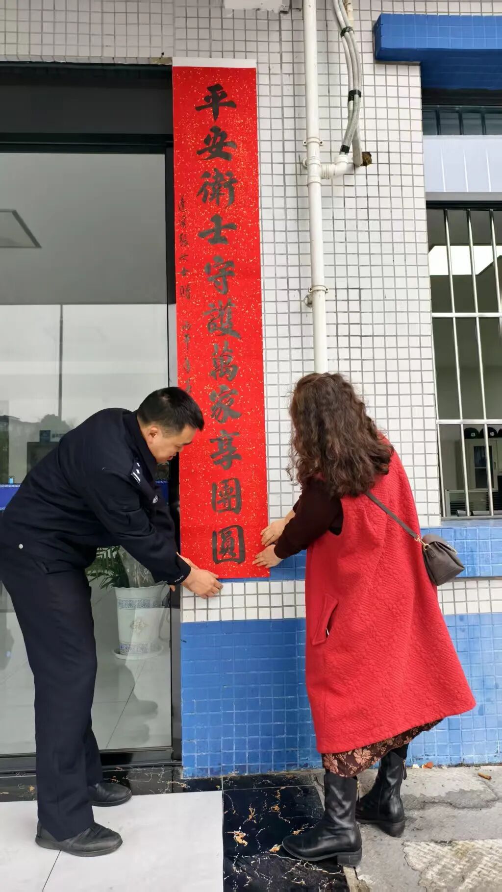 3月13日,张女士送来对联,和民警一起将对联贴在派出所大门上。对联在阳光下熠熠生辉,每一笔每一划都凝聚着群众最真挚的感谢,也承载着民警最执着的坚守。