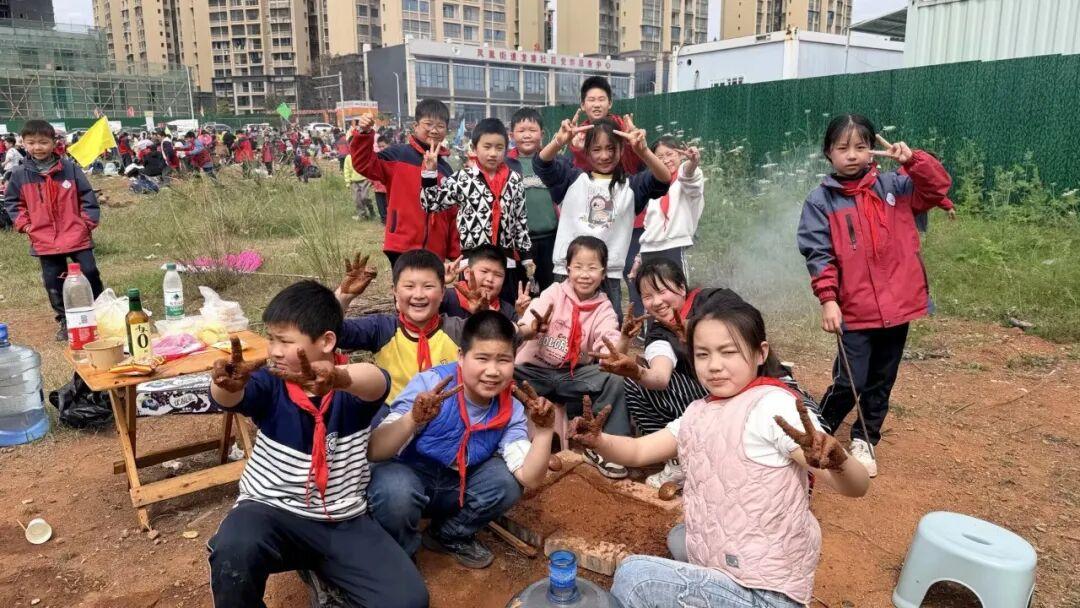 对于四、五、六年级的哥哥姐姐们来说,今天的角色不再是“小朋友”,而是妥妥的“当家大厨”。活动一开始,现场就热闹了起来。只见孩子们分工明确,配合默契:有的搬砖搭灶,像模像样地建起“厨房”;有的洗菜切菜,刀工虽然稚嫩,但认真的样子最可爱;有的生火添柴,哪怕被烟熏得眼泪直流,也坚守岗位。“滋啦——” 随着油锅烧热,食材下锅,香味瞬间弥漫开来。