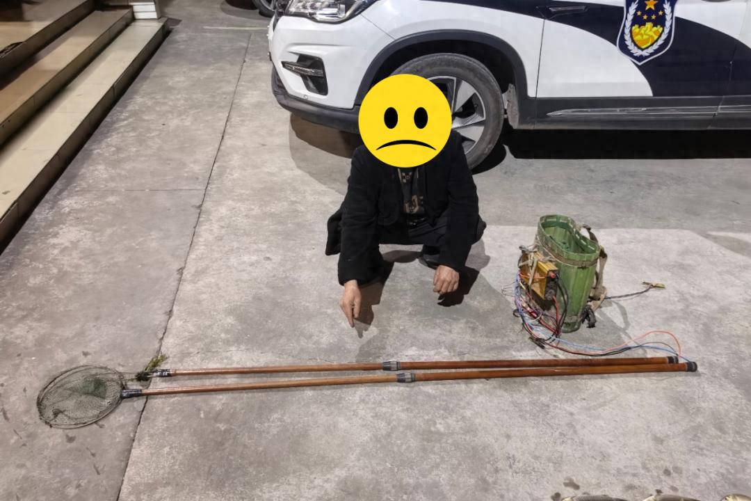 2026年3月6日22时许,大英县公安局玉峰派出所民辅警开展夜间巡逻时,发现辖区河边有可疑灯光闪烁,且伴随异常动静。民辅警立即警觉,悄悄上前核查,当场撞见两名男子手拿改装电鱼设备,在河道内非法捕捞水产品。