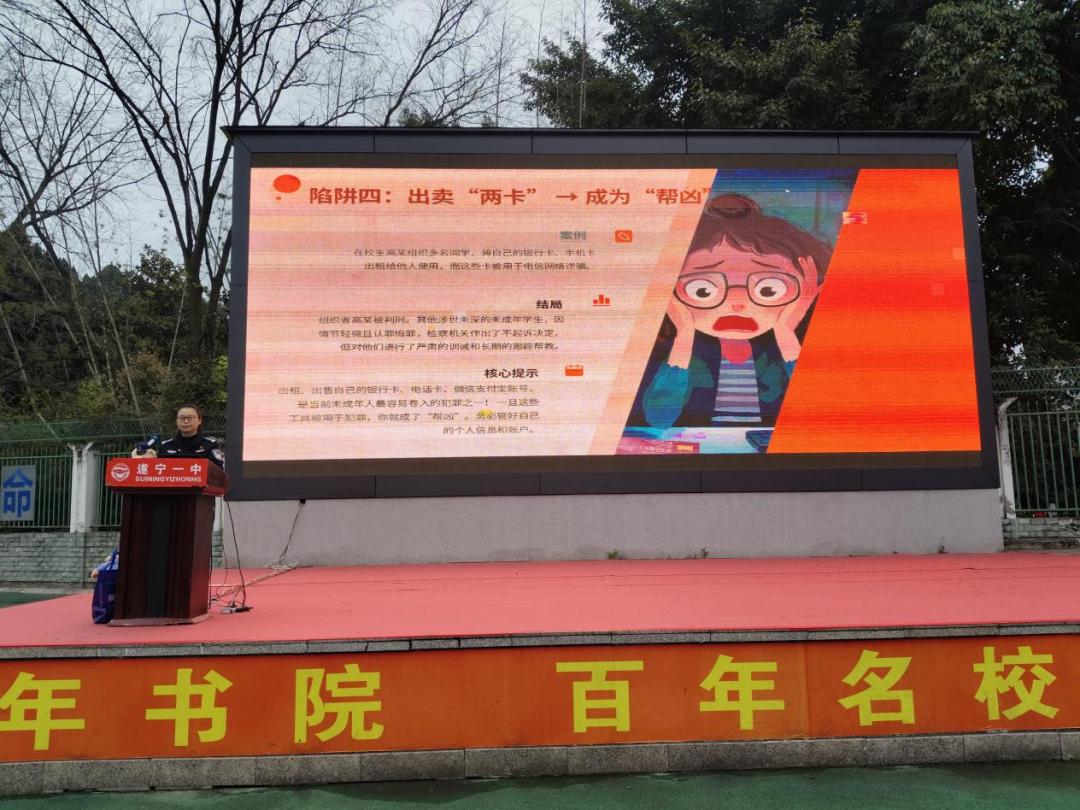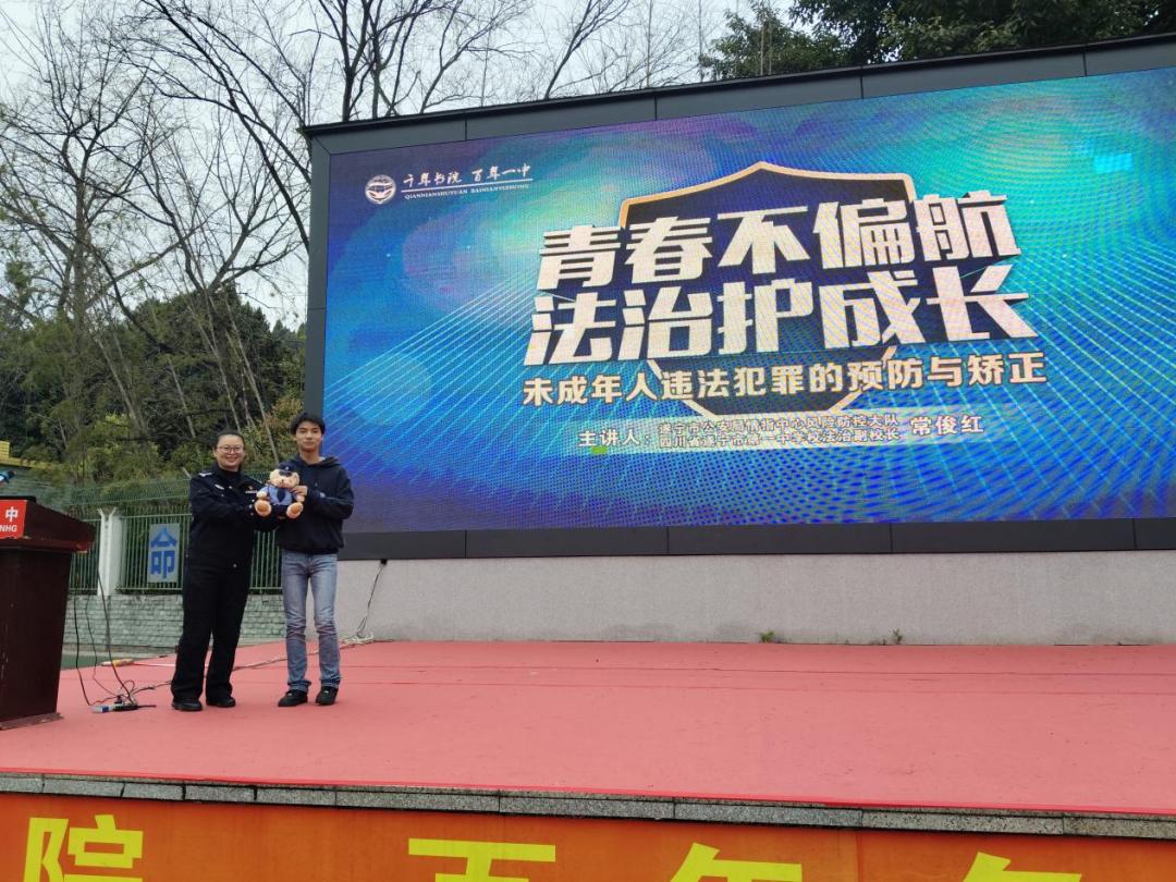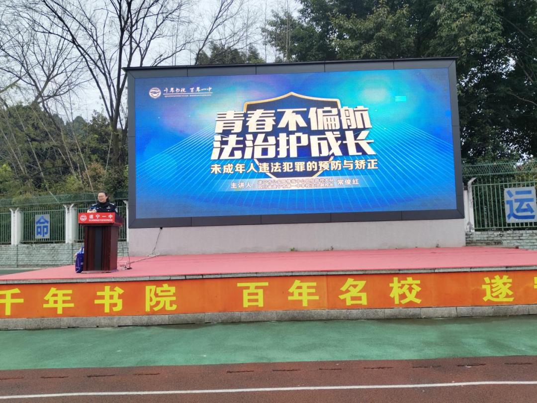 为进一步加强未成年人法治教育,预防青少年违法犯罪,护航初中生健康成长,3月23日,遂宁一中学校(文苑校区)特邀学校法治副校长、市公安局情指中心风险防控大队常俊红警官,开展以“青春不偏航,法治护成长”为主题的法治专题讲座。学校党委副书记、校长邓再兵、副校长校区负责人邓建、分管安全副校长蒋涛、法治辅导员林敏、校区行政干部、常驻校警等出席活动,全体师生现场聆听讲座。