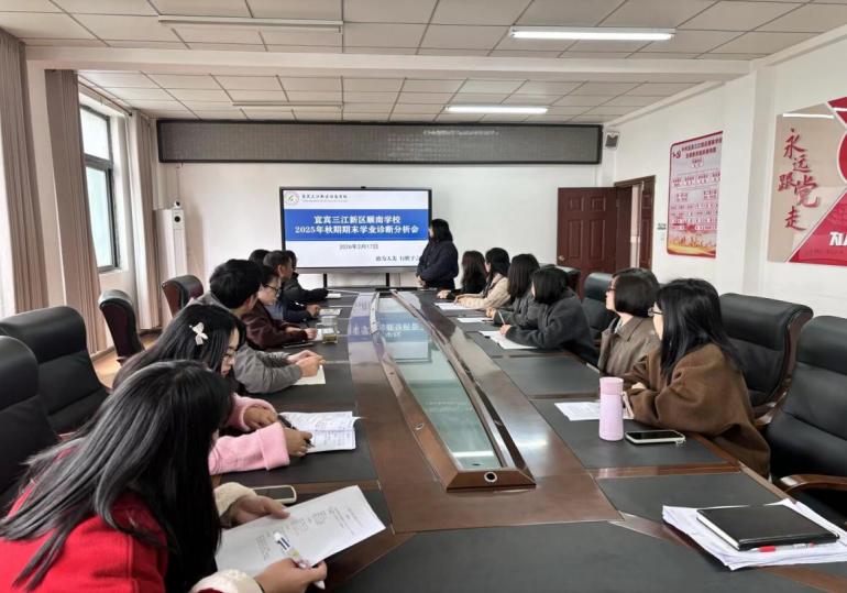 为精准剖析2025年秋期小学语文教学成效,明确新学期教学提质方向,切实落实教学质量提升目标,2026年3月17日下午,宜宾三江新区顺南学校在四楼会议室召开了小学语文期末成绩分析会。学校校长、分管副校长、教务处主任及全体小学语文教师参会,会议由教研组长组织主持,以“精准分析,提质增效”为核心议题,层层拆解教学问题、务实部署改进举措。
