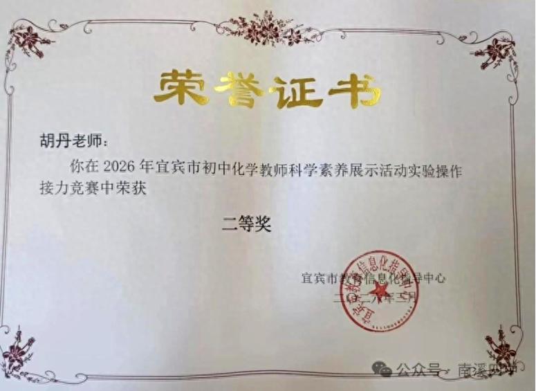 近日,2026年宜宾市初中化学教师科学素养展示活动实验操作接力竞赛圆满落幕。南溪区第四中学校胡丹老师在全市众多优秀教师中脱颖而出,荣获了二等奖!