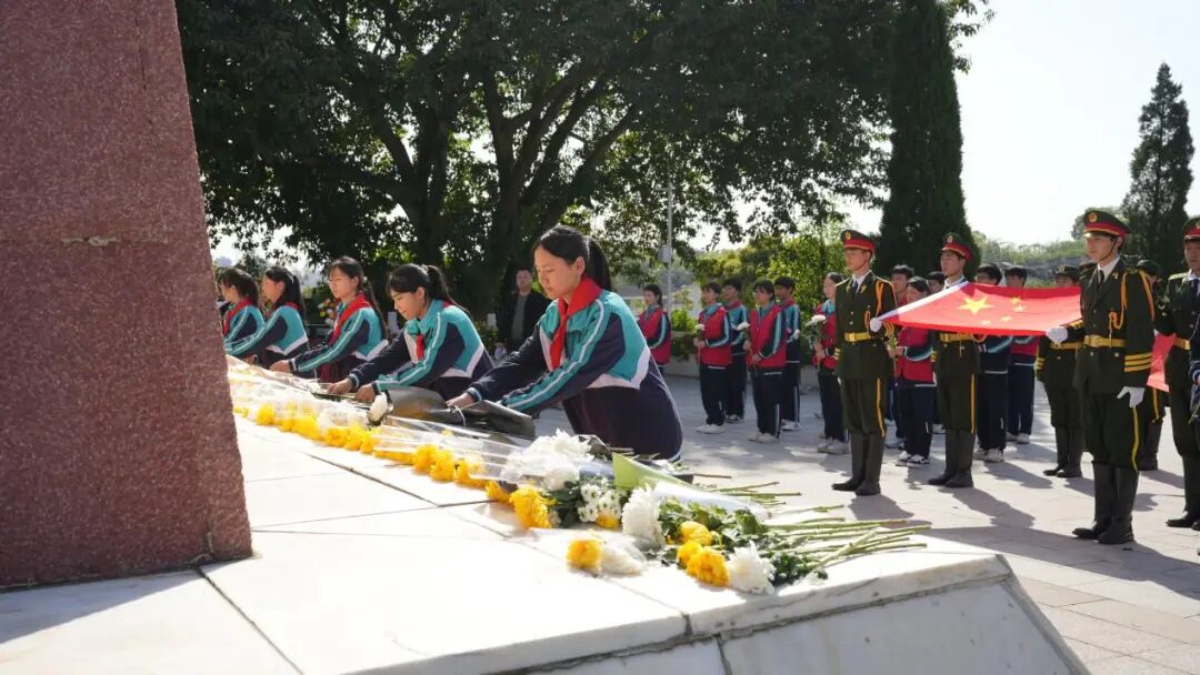 主持人宣布鞠躬致敬,全体师生肃立,面向烈士纪念碑三鞠躬,深切缅怀先烈们的不朽功绩,铭记他们为民族独立和人民幸福作出的伟大牺牲。