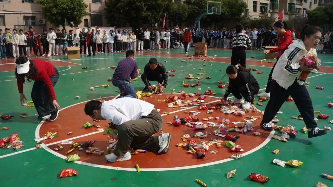 活动现场,篮球场上堆满了琳琅满目的零食,鲜红的活动横幅高悬教学楼前,“为爱冲刺 为你而战”的标语点燃了全场热情。随着比赛开始的指令下达,南溪区第四中学校各班班主任化身“冲锋战士”,在铺满零食的场地上奋力“抢收”,老师们快速捡拾,每一个动作都充满活力与干劲,场边围观的师生们加油声、欢呼声此起彼伏,将现场气氛推向高潮。