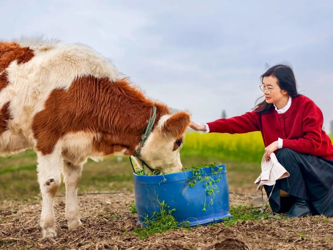 市民在圣平岛田间轻抚小牛,尽享春日乡野慢时光。姜斌 摄