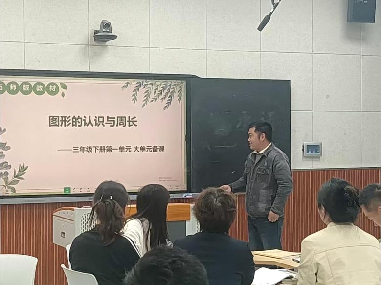 南溪区福临小学校三年级老师谭弟垚聚焦下册第一单元《图形的认识与周长》,提出以图形特征认知为基础,引导学生理解周长的本质含义,通过测量、探究推导长方形、正方形周长公式,发展学生的量感与空间观念。
