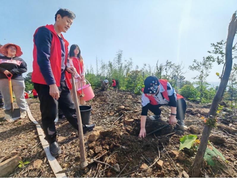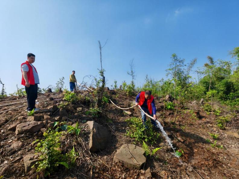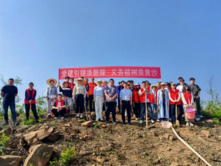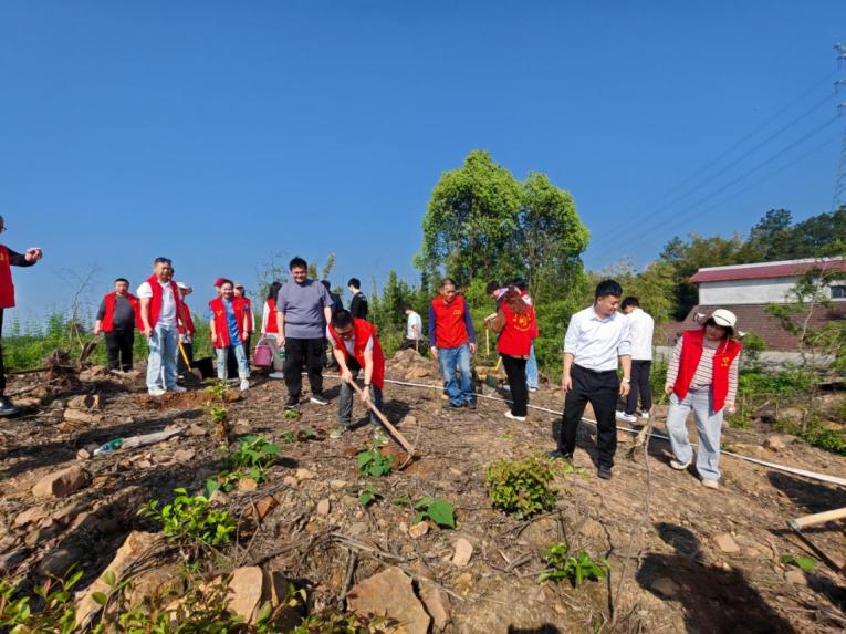 挥锹铲土、扶苗正根、培土压实、提水浇灌……大家分工协作、配合默契,现场一派热火朝天的劳动景象 。“坑要挖标准、土要踩紧实,确保每棵树苗都能成活!”老党员带头示范,年轻干部干劲十足,汗水浸湿了衣衫,笑容却洋溢在脸庞,一棵棵树苗在大家的精心栽种下扎根沃土、迎风挺立。