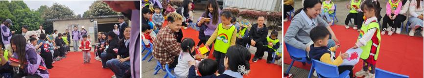 为进一步增进亲子感情和园所间的交流,活跃活动气氛,活动设置了游戏环节。“口香糖黏哪里” 的破冰游戏让亲子互动更加亲密,欢声笑语不断;套圈活动里,亲子家庭在指定位置参与挑战,南瓜、土豆、红薯等本土农作物作为奖品,让孩子们在游戏中收获惊喜,感受乡土生活的乐趣。