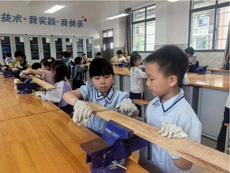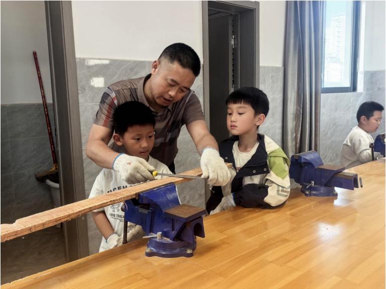 课堂上,佩戴防护手套的孩子们化身专注的“小创客”“小工匠”:有的左手稳稳扶住木料,右手匀速拉动手锯,木屑如细碎金屑簌簌飘落;有的在老师指导下,精准测量木料、调整锯切角度,每一个动作都认真严谨;还有孩子用锉刀修整边缘,让粗糙木料逐渐变得光滑细腻。孩子们相互交流技巧、互帮互助,在动手实践中锻炼动手能力、培养合作意识,在反复打磨中涵养耐心与专注力。