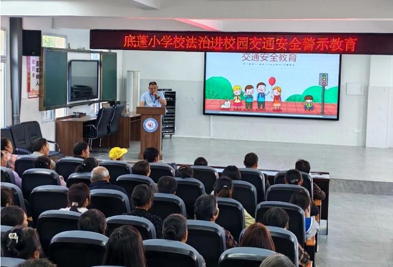 江安县夕佳山镇底蓬小学校特邀请法治副校长周建虎一行开展校园交通安全宣传教育活动。本次活动采用家校同场模式,邀请家长代表共同参与,与孩子们共同学法、懂法、守法。