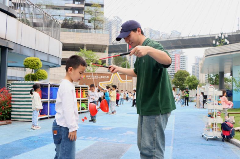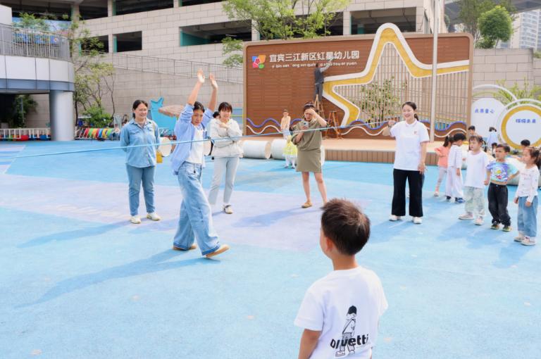 家长们走进三江新区红星幼儿园户外游戏区,亲身参与孩子们的日常活动——陀螺旋转、空竹飞扬、跳皮筋、滚铁环、滑索、骑行……