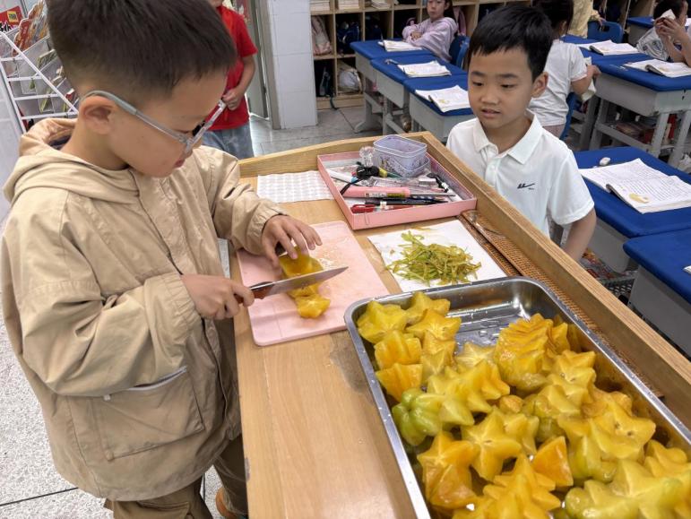 课堂上,谭老师带领同学们完整学习《画杨桃》一课,引导同学们理解“从不同角度观察事物,会有不同结果”的道理。课后,老师为孩子们分发新鲜杨桃,同学们从不同角度观察杨桃的形状,闻果香、品酸甜,在亲身体验中验证课文内容。
