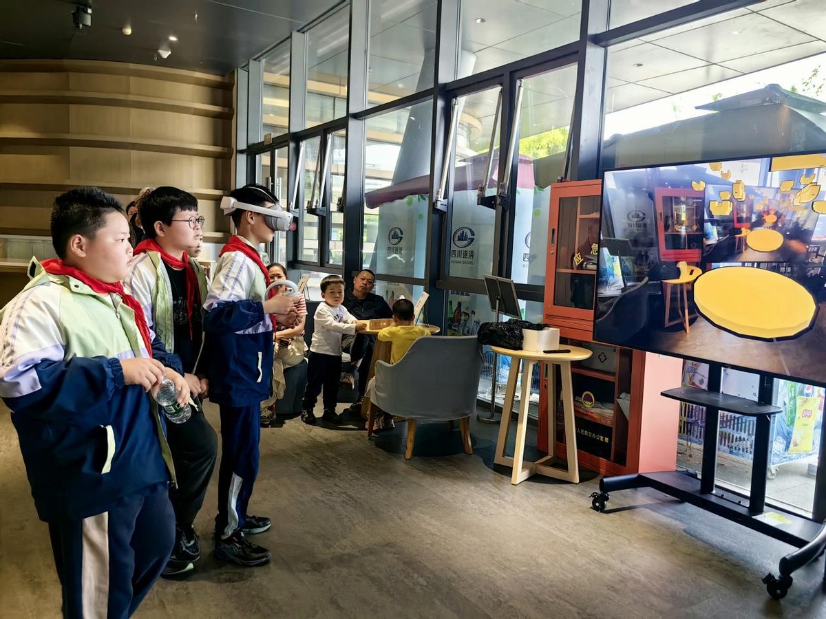 现场不仅复原了经典古建筑模型,还特别设置了互动体验区,观众可亲手组装鲁班锁、鲁班桥等木质模型,也可以用AR设备在虚拟世界中体验“工匠”角色,感受榫卯咬合的力学之美与东方哲学、美学精神。此外,展区还配置了遂宁科普儿童文学及古建筑专题图书,供读者现场阅览或借阅。