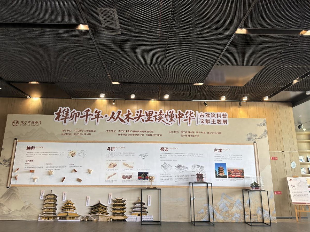 近日,由遂宁市文化广电体育旅游局、市社科联、团市委主办,市图书馆、市青少年宫、市科技馆、市图书馆学会承办的“榫卯千年——从木头里读懂中华”古建筑科普文献主题展在遂宁市图书馆一楼大厅正式开展。