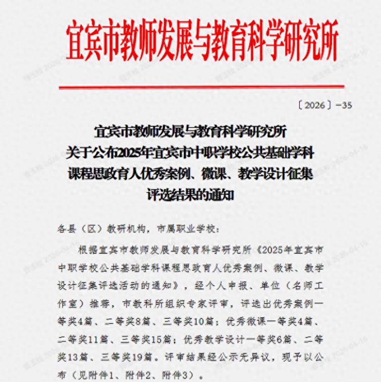 喜讯传来,硕果盈枝!近日,由宜宾市教师发展与教育科学研究所主办的2025年宜宾市中职学校公共基础学科课程思政育人优秀案例、微课、教学设计征集评选活动圆满收官,宜宾市叙州区高新综合高级中学校教师团队凭借过硬实力与匠心创作,在全市众多参赛作品中脱颖而出,一举斩获多项重磅荣誉,尽显育人风采!
