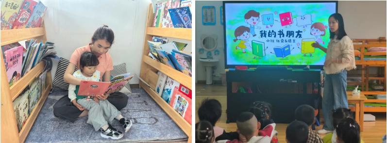 园所与班级精心打造阅读空间:门厅书香角陈列着精美绘本与童趣自制绘本,班级图书漂流站张贴温馨阅读公约,一面面阅读打卡墙,记录着孩子们与书香相伴的美好瞬间。
