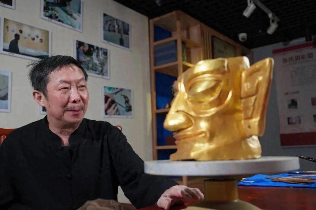 “徐氏泥彩塑”国家级非遗代表性传承人徐兴国创作“三星堆青铜大面具”。