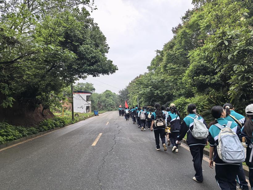 一路上,各班队列整齐、步伐一致,同学们精神饱满,沿着既定路线有序行进。班主任和任课教师分散在队伍前后,时刻关注学生状态,提醒大家注意路况、保持间距。安全保障组的4名保安在沿途关键路口巡查引导,确保交通安全。