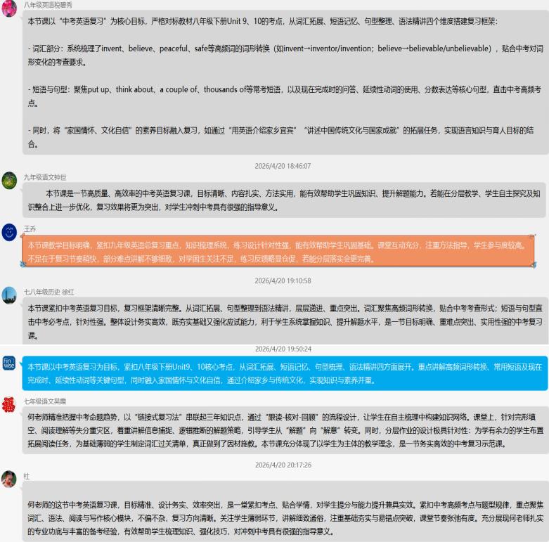 课后,何春艳老师分享了自己的教学设计思路,在中考复习压力下,坚持素养导向,挖掘教材育人点,以跨学科视角整合内容,让家国情怀自然渗透。本组教师肯定本课应试与育人并重,实现语言知识与文化意识、家国情怀的统一。同时,也探讨跨学科教学难点,课时协调、内容整合、评价统一等问题。最终达成坚持立德树人的共识,把家国情怀作为文科教学核心目标。立足中考与课堂,将价值引领融入常态教学。