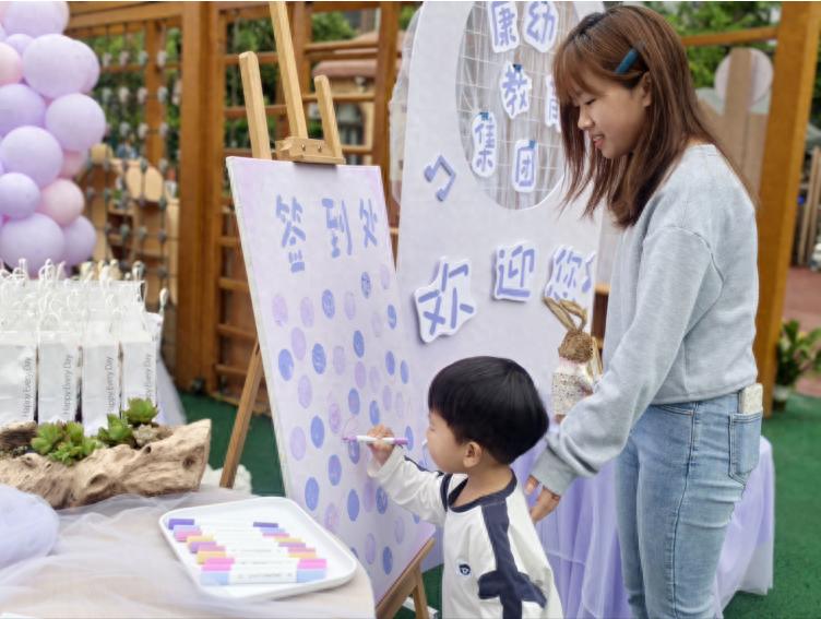 康安幼儿园以“紫韵童趣·色彩探险”为脉络,打造温馨治愈的早教体验。活动现场以淡紫色为主调,气球花簇、色彩通道、手印签到墙相映成趣,宝贝们化身小小探险家,在满满仪式感中开启探索之旅。
