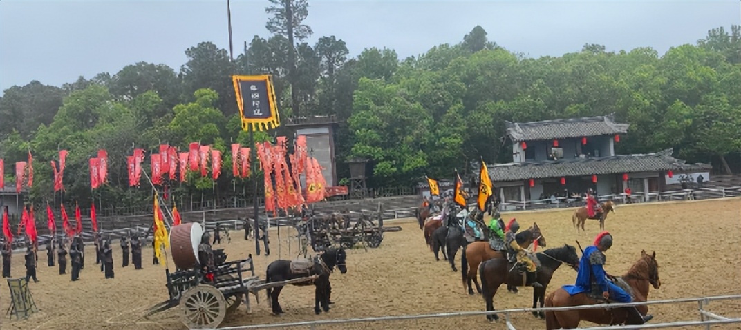 辕门营帐错落排布,烽火台、点将台气势凛然,战船列于湖畔,校场宽阔规整,将影视剧中金戈铁马的经典场面尽数还原。沉浸式实景马战演出震撼人心——武将驰骋沙场,两军对阵厮杀,鼓点震天,号角齐鸣,将群雄逐鹿的豪迈激情演绎得淋漓尽致。真切体会乱世争霸的波澜壮阔,真可谓: