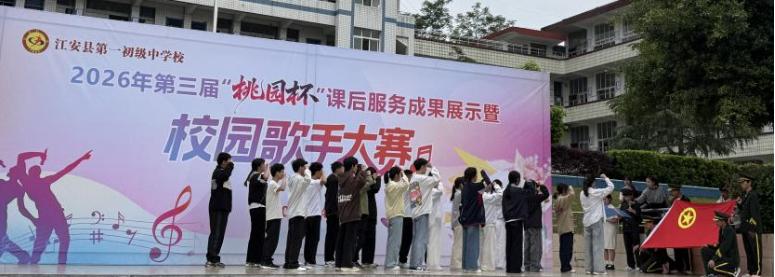 为传承五四薪火,丰富校园文化生活,展现新时代青少年昂扬向上的精神风貌,4月30日,江安县第一初级中学校举办了2026年第三届“桃园杯”课后服务成果展示暨校园歌手大赛。本次活动以歌声为载体,将青春理想与五四精神深度融合,为全校师生带来了一场充满朝气与力量的视听盛宴。